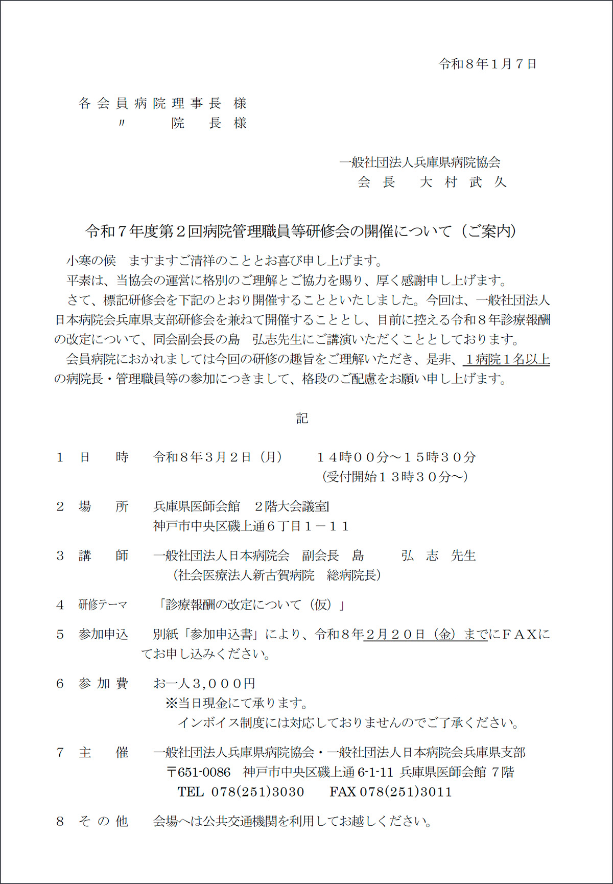今回は、一般社団法人 日本病院会兵庫県支部研修会を兼ねて開催することとし、目前に控える令和8年診療報酬の改定について、同会副会長の島 弘志先生にご講演いただくこととしております。ぜひご参加ください。